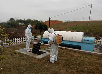 2021年12月22日科然環境運維組員工為號召國家防控疫情政策,對各個終端和管網的污水池進行全面的清掏、消殺工作。運維組消殺人員配有專業的防護服、手套、口罩以及專業的消殺工具。